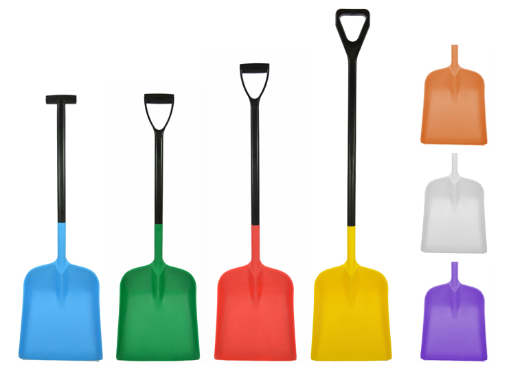 Kühvel, D-käepide, 334x410x1159 mm, valmistatud polüpropüleenist, kasutatav toiduainetetööstuses temperatuuril -30…+ 80°, laos roheline ja kollane